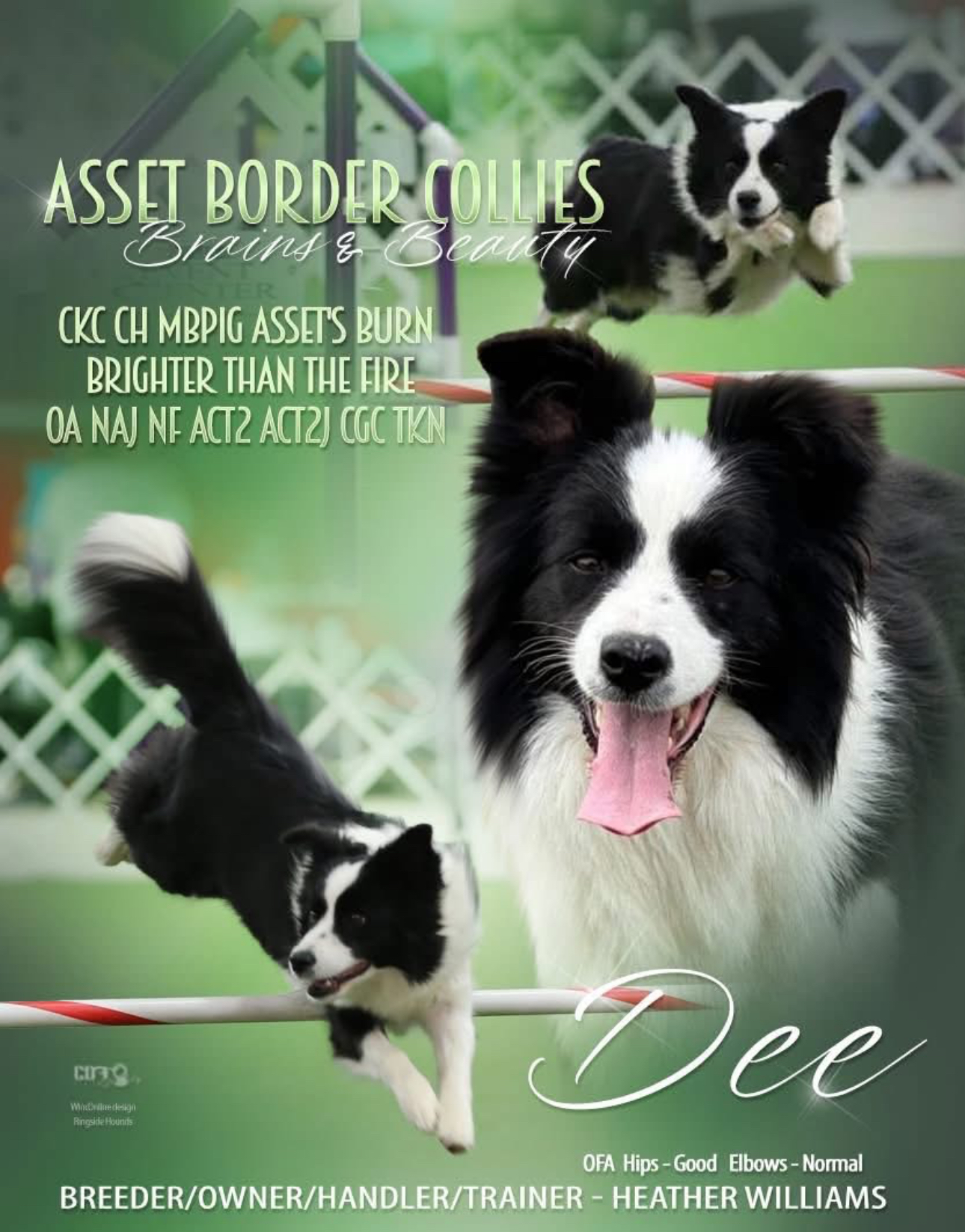 Dee is an amazing young female. She loves agility, rally and playing with the other dogs. She is very biddable and always excels in everything we try. Dee has all her clearances and is expecting her first litter of puppies early November 2025. She is truly a well rounded girl and the titles she has achieved are a compliment to her success.